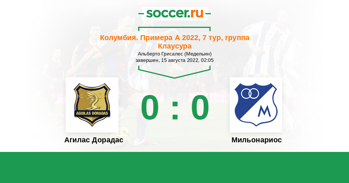 Колумбия. Примера А 30.10.2019 Агилас Дорадас Логотип футбольный клуб Агилас Дорадас (Рионегро) 0:0 Логотип футбольный клуб Мильонариос (Богота) Мильонариос