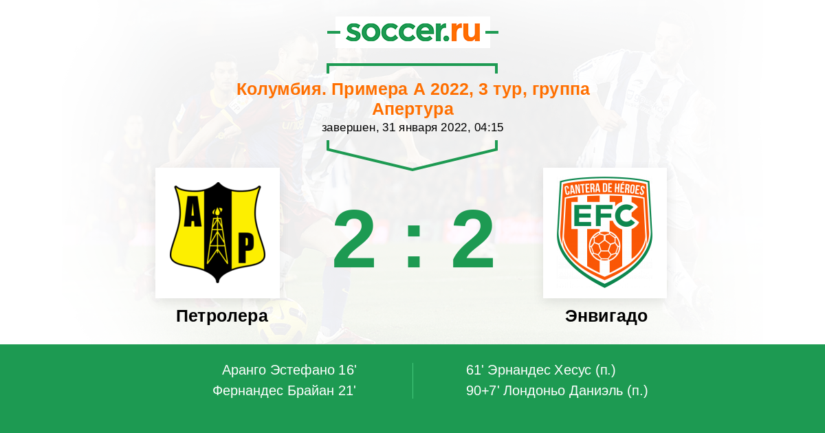 Колумбия. Примера А 18.04.2015 Петролера Логотип футбольный клуб Петролера 1:2 Логотип футбольный клуб Энвигадо Энвигадо