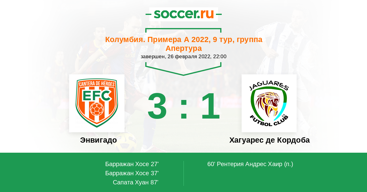 Колумбия. Примера А 03.02.2021 Энвигадо Логотип футбольный клуб Энвигадо 1:1 Логотип футбольный клуб Хагуарес де Кордоба (Монтерия) Хагуарес де Кордоба