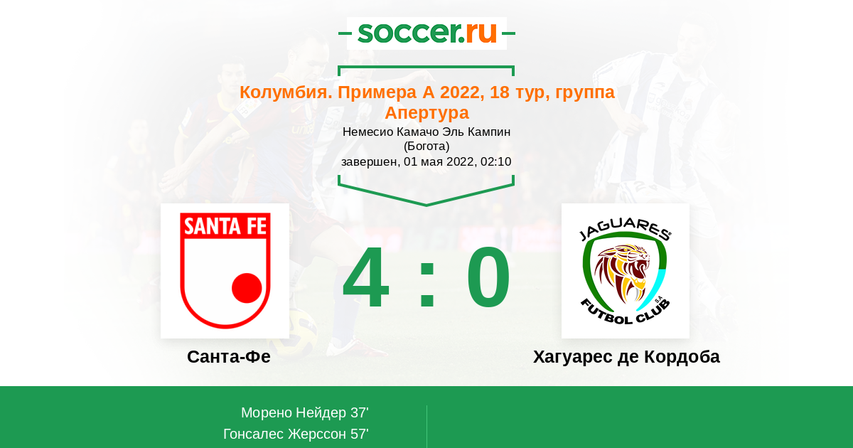 Колумбия. Примера А 28.04.2016 Хагуарес де Кордоба Логотип футбольный клуб Хагуарес де Кордоба (Монтерия) 2:1 Логотип футбольный клуб Санта-Фе (Богота) Санта-Фе