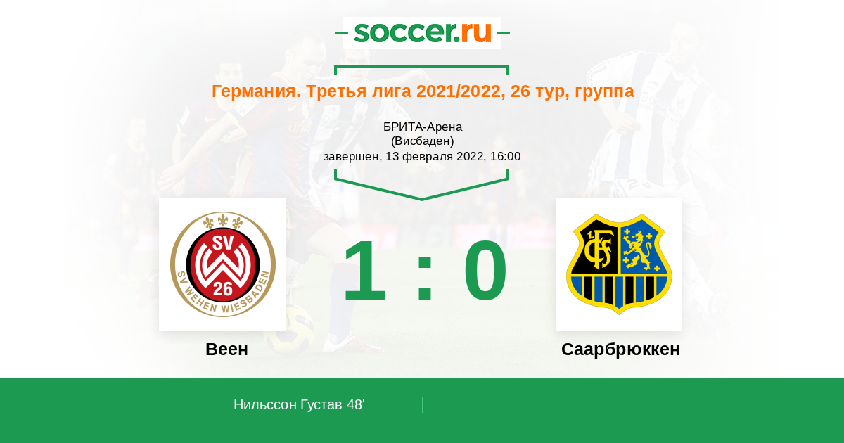 Германия. Третья лига 03.09.2021 Саарбрюккен Логотип футбольный клуб Саарбрюккен 3:4 Логотип футбольный клуб Веен (Висбаден) Веен