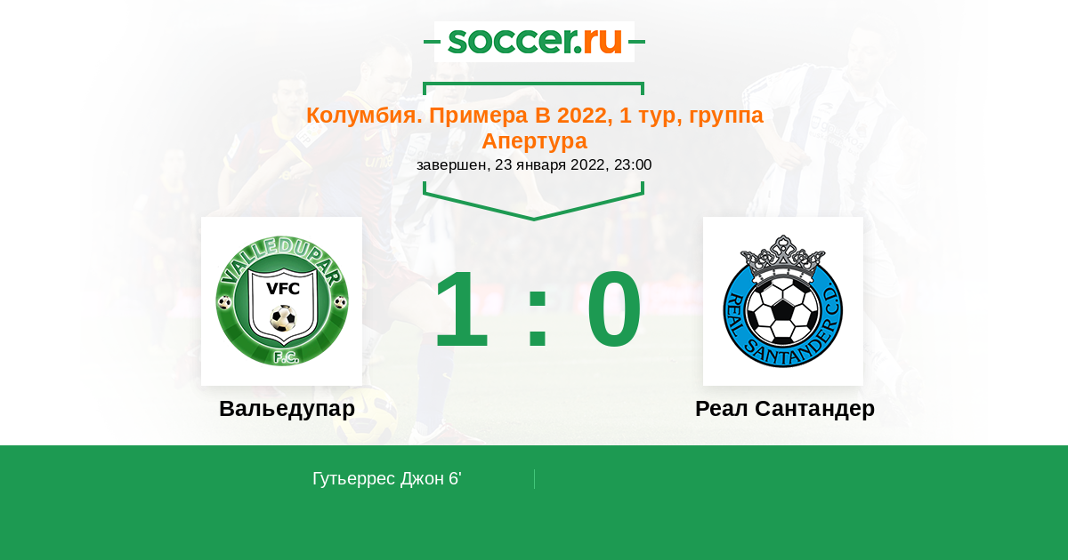 Колумбия. Примера B 07.09.2022 Реал Сантандер Логотип футбольный клуб Реал Сантандер (Букараманга) 1:0 Логотип футбольный клуб Вальедупар Вальедупар