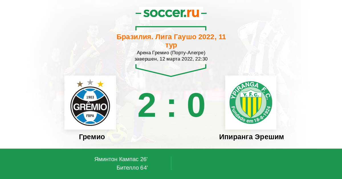 Бразилия. Лига Гаушо 26.03.2022 Ипиранга Эрешим Логотип футбольный клуб Ипиранга Эрешим 0:1 Логотип футбольный клуб Гремио (Порту-Алегри) Гремио
