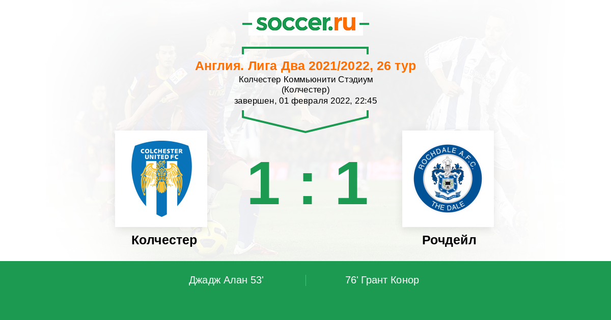 Англия. Вторая Футбольная Лига 24.09.2022 Колчестер Логотип футбольный клуб Колчестер 0:1 Логотип футбольный клуб Рочдейл Рочдейл