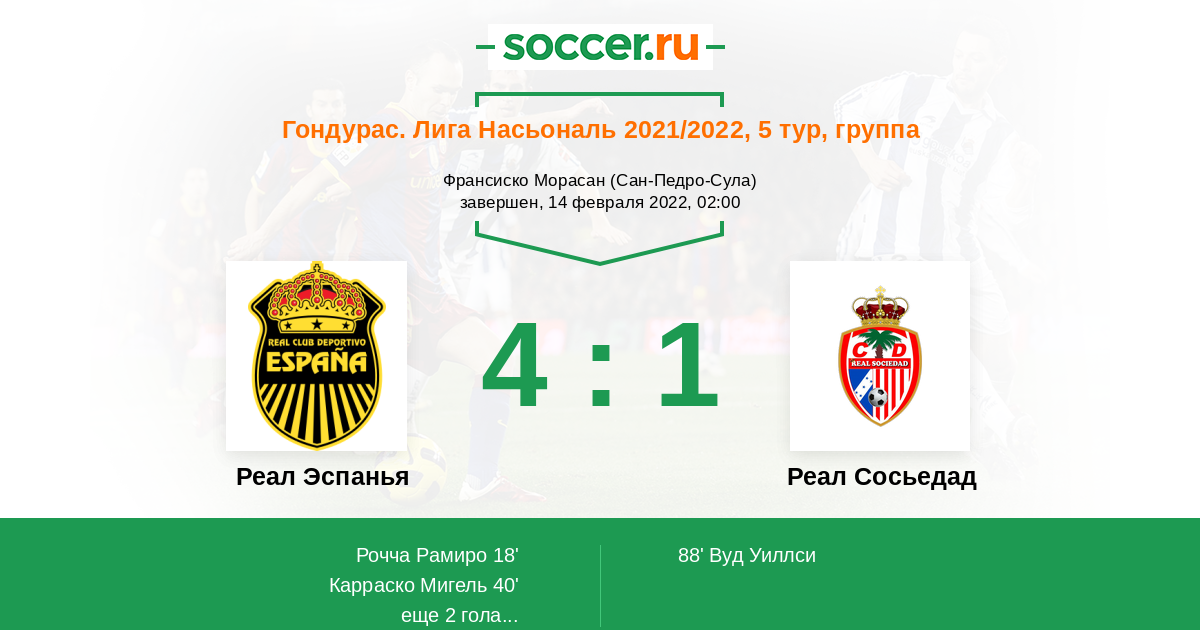 Гондурас. Лига Насьональ 12.04.2018 Реал Эспанья Логотип футбольный клуб Реал Эспанья (Сан-Педро-Сула) 1:0 Логотип футбольный клуб Реал Сосьедад (Токоа) Реал Сосьедад