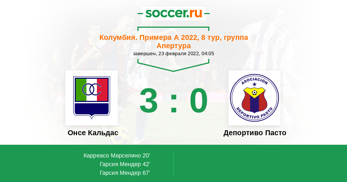 Колумбия. Примера А 14.03.2023 Онсе Кальдас Логотип футбольный клуб Онсе Кальдас (Манисалес) 0:1 Логотип футбольный клуб Депортиво Пасто Депортиво Пасто