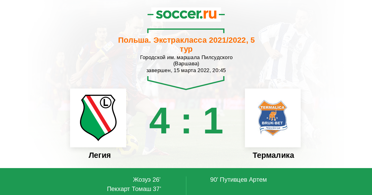 В матче встречающихся сегодня в польском Экстраклассе команд Легия и Термалика рискну поставить на победу хозяев потому, как они располагаются выше в турнирной таблице, плюс активнее атакуют и надёжнее обороняются.