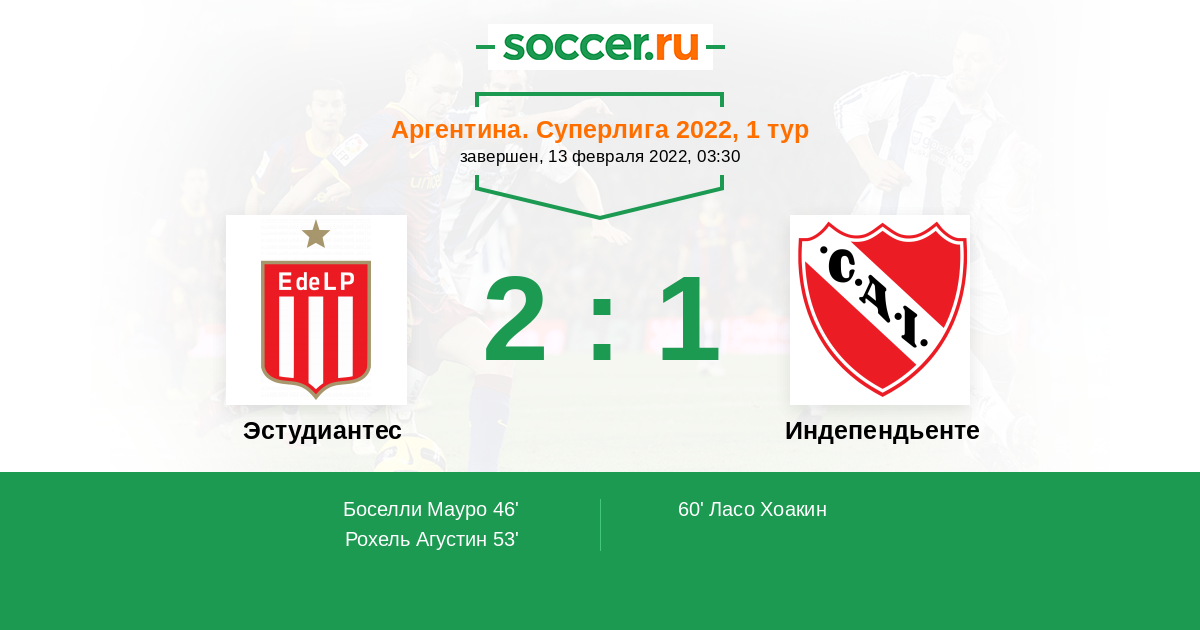 Аргентина. Суперлига 21.06.2022 Индепендьенте Логотип футбольный клуб Индепендьенте (Авельянеда) 2:1 Логотип футбольный клуб Эстудиантес (Ла-Плата) Эстудиантес