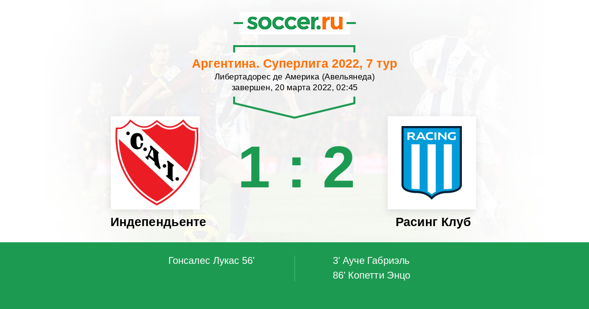 Аргентина. Суперлига 09.08.2021 Индепендьенте Логотип футбольный клуб Индепендьенте (Авельянеда) 1:0 Логотип футбольный клуб Расинг Клуб (Авельянеда) Расинг Клуб