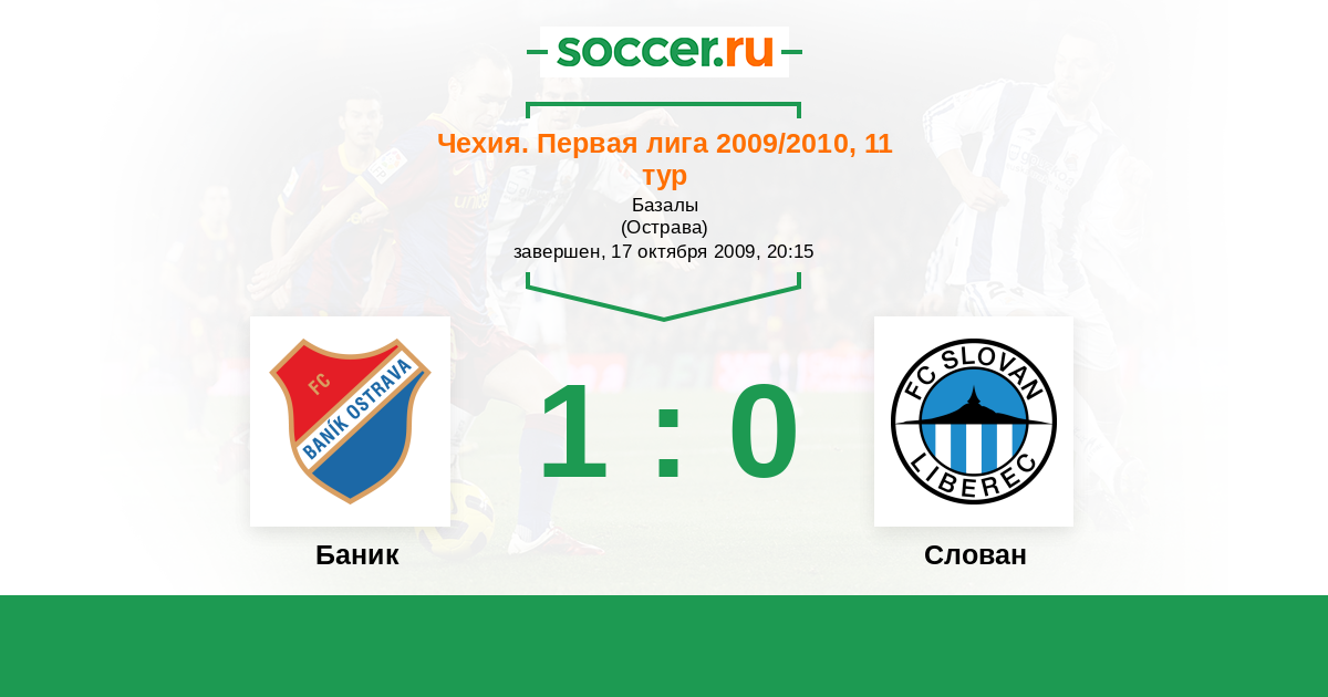 Чехия. Первая Лига 10.09.2010 Слован Логотип футбольный клуб Слован (Либерец) 4:1 Логотип футбольный клуб Баник (Острава) Баник