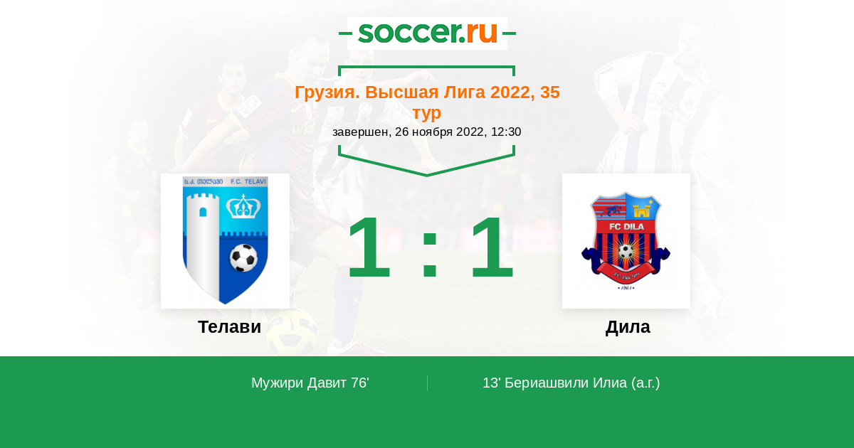 Грузия. Высшая лига 12.04.2021 Телави Логотип футбольный клуб Телави 0:2 Логотип футбольный клуб Дила (Гори) Дила