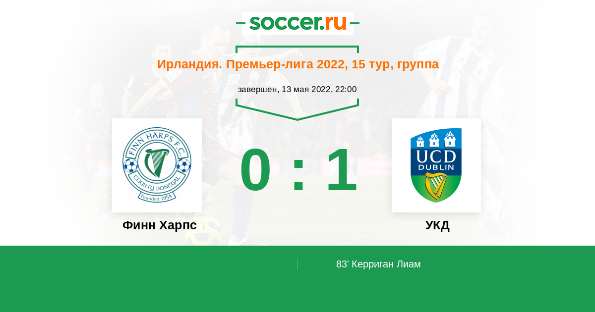 Ирландия. Премьер-лига 12.08.2022 УКД Логотип футбольный клуб УКД (Дублин) 2:1 Логотип футбольный клуб Финн Харпс (Баллибофи) Финн Харпс