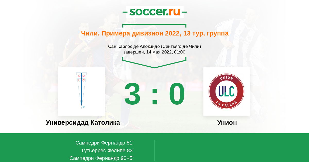 Чили. Примера дивизион 08.05.2021 Универсидад Католика Логотип футбольный клуб Универсидад Католика (Сантьяго) 3:0 Логотип футбольный клуб Унион (Ла Калера) Унион