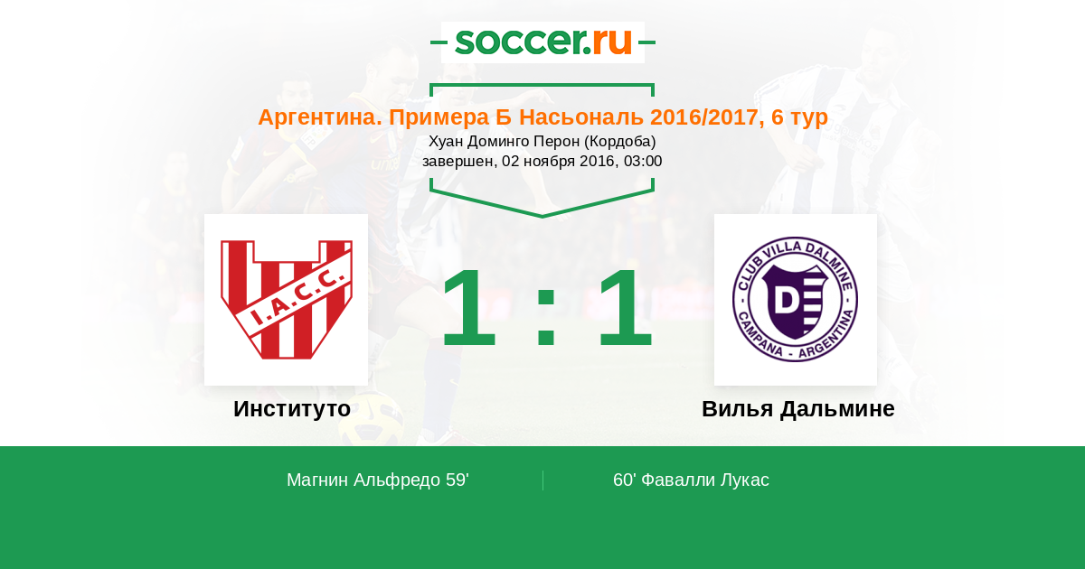 Аргентина. Примера Б Насьональ 02.11.2016 Институто Логотип футбольный клуб Институто (Кордоба) 1:1 Логотип футбольный клуб Вилья Дальмине (Кампана) Вилья Дальмине