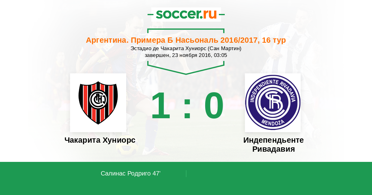 Аргентина. Примера Б Насьональ 23.11.2016 Чакарита Хуниорс Логотип футбольный клуб Чакарита Хуниорс (Сан Мартин) 1:0 Логотип футбольный клуб Индепендьенте Ривадавия (Мендоса) Индепендьенте Ривадавия