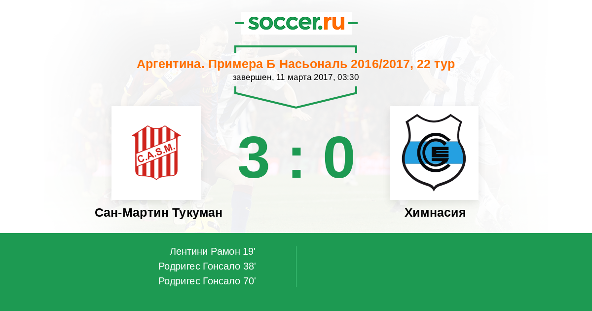 Аргентина. Примера Б Насьональ 11.03.2017 Сан-Мартин Тукуман Логотип футбольный клуб Сан-Мартин Тукуман 3:0 Логотип футбольный клуб Химнасия (Жужуй) Химнасия