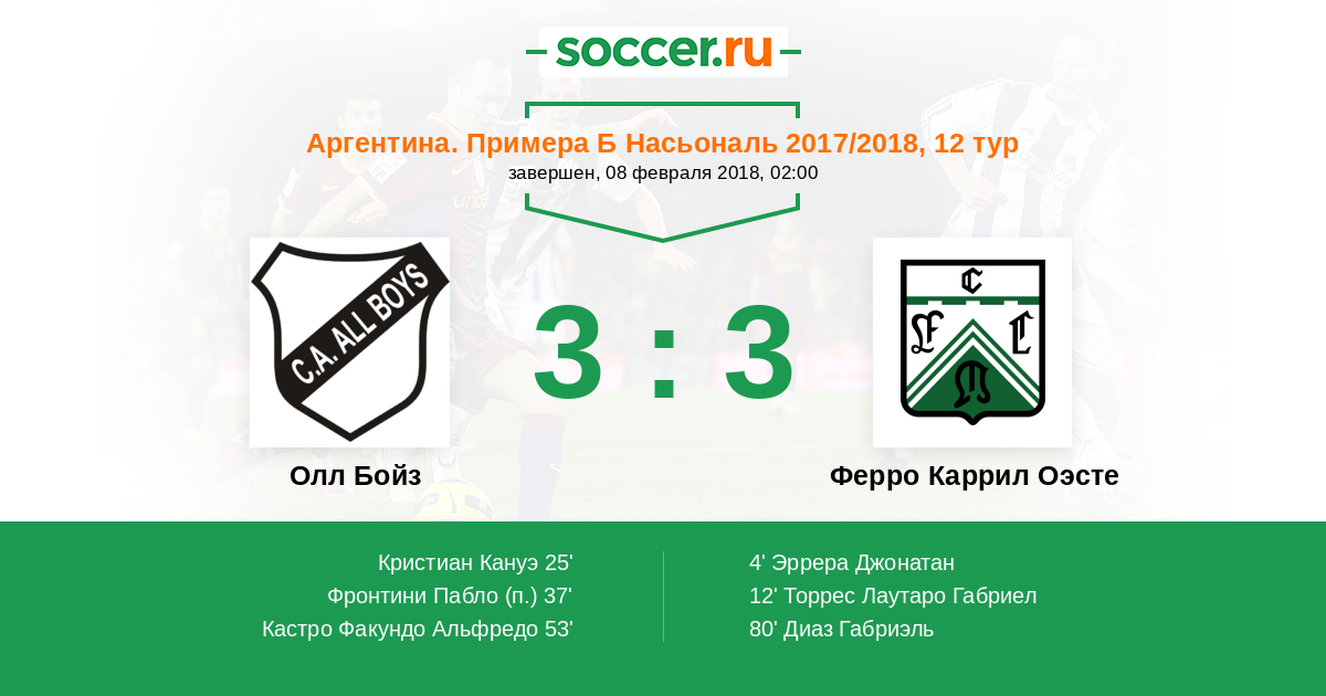 Аргентина. Примера Б Насьональ 16.07.2017 Олл Бойз Логотип футбольный клуб Олл Бойз (Буэнос-Айрес) 1:0 Логотип футбольный клуб Ферро Каррил Оэсте (Буэнос-Айрес) Ферро Каррил Оэсте