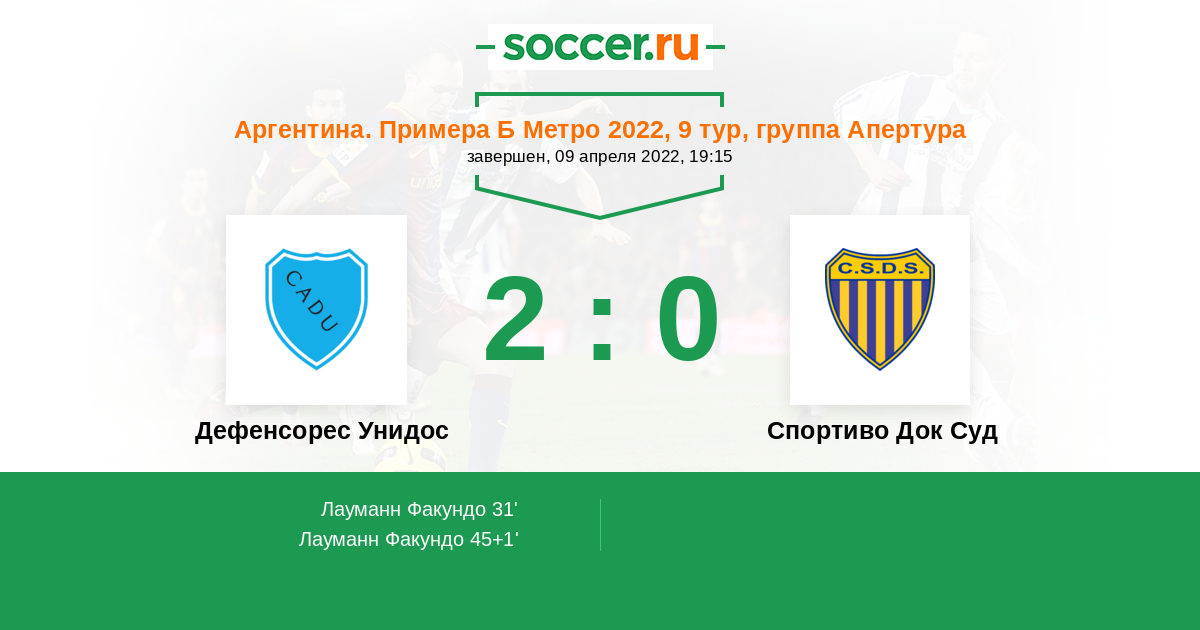 Аргентина. Примера С Метро 21.09.2014 Спортиво Док Суд Логотип футбольный клуб Спортиво Док Суд (Буэнос-Айрес) 2:0 Логотип футбольный клуб Дефенсорес Унидос (Сарате) Дефенсорес Унидос