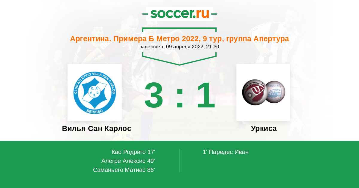 Аргентина. Примера Б Метро 06.08.2022 Уркиса Логотип футбольный клуб Уркиса (Вилья Линч) 1:0 Логотип футбольный клуб Вилья Сан Карлос (Берисо) Вилья Сан Карлос
