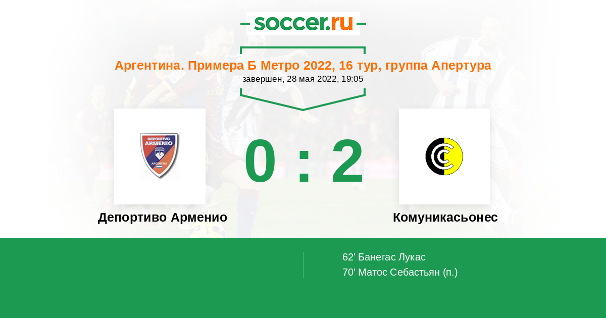 Аргентина. Примера Б Метро 28.05.2016 Депортиво Арменио Логотип футбольный клуб Депортиво Арменио 0:1 Логотип футбольный клуб Комуникасьонес (Буэнос-Айрес) Комуникасьонес