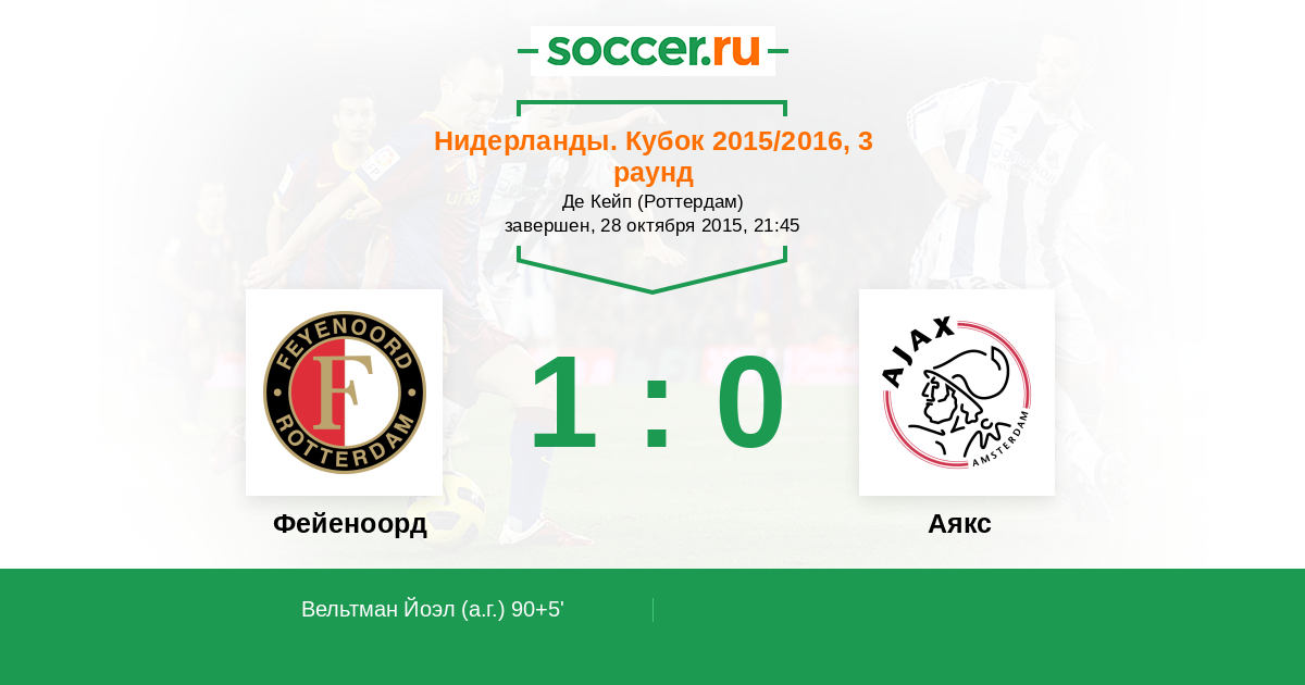 Нидерланды. Эредивизи 07.02.2016 Аякс Логотип футбольный клуб Аякс (Амстердам) 2:1 Логотип футбольный клуб Фейеноорд (Роттердам) Фейеноорд