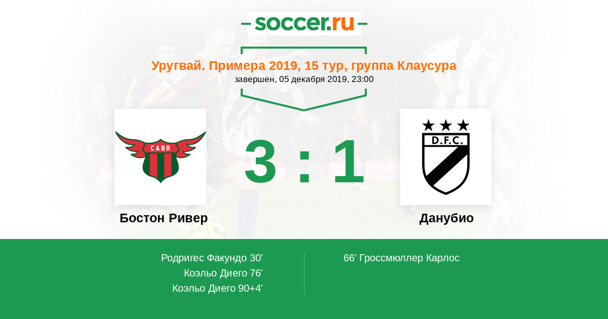 Уругвай. Примера A 05.12.2019 Бостон Ривер Логотип футбольный клуб Бостон Ривер (Монтевидео) 3:1 Логотип футбольный клуб Данубио (Монтевидео) Данубио