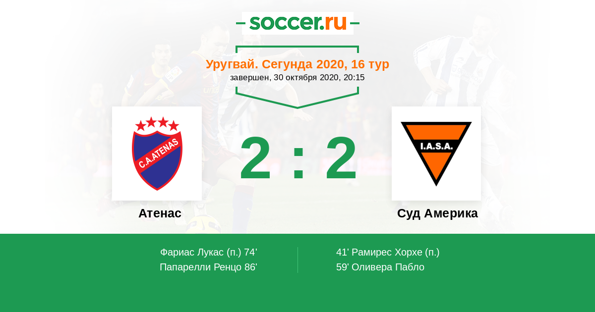 Уругвай. Сегунда 04.09.2020 Суд Америка Логотип футбольный клуб Суд Америка (Монтевидео) 6:0 Логотип футбольный клуб Атенас (Сан Карлос) Атенас