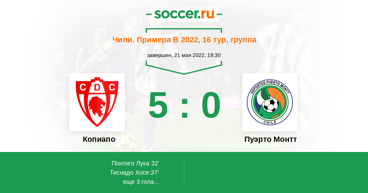 Чили. Примера В 20.11.2022 Копиапо Логотип футбольный клуб Копиапо 4:0 Логотип футбольный клуб Пуэрто Монтт Пуэрто Монтт