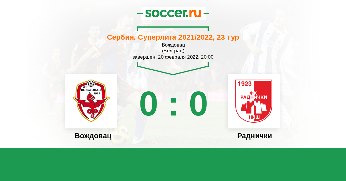 Сербия. Суперлига 15.04.2022 Раднички Логотип футбольный клуб Раднички (Ниш) 0:0 Логотип футбольный клуб Вождовац (Белград) Вождовац