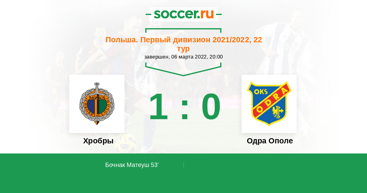 Польша. Первый дивизион 01.05.2023 Одра Ополе Логотип футбольный клуб Одра Ополе 1:0 Логотип футбольный клуб Хробры (Глогув) Хробры
