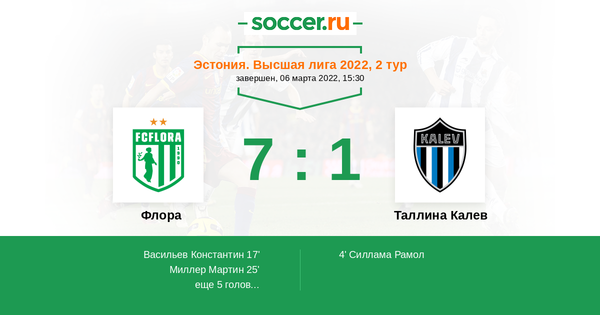 Эстония. Высшая лига 17.07.2022 Флора Логотип футбольный клуб Флора (Таллин) 2:0 Логотип футбольный клуб Таллина Калев Таллина Калев