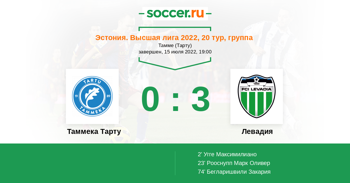 Эстония. Высшая лига 02.04.2022 Левадия Логотип футбольный клуб Левадия (Таллин) 4:0 Логотип футбольный клуб Таммека Тарту Таммека Тарту
