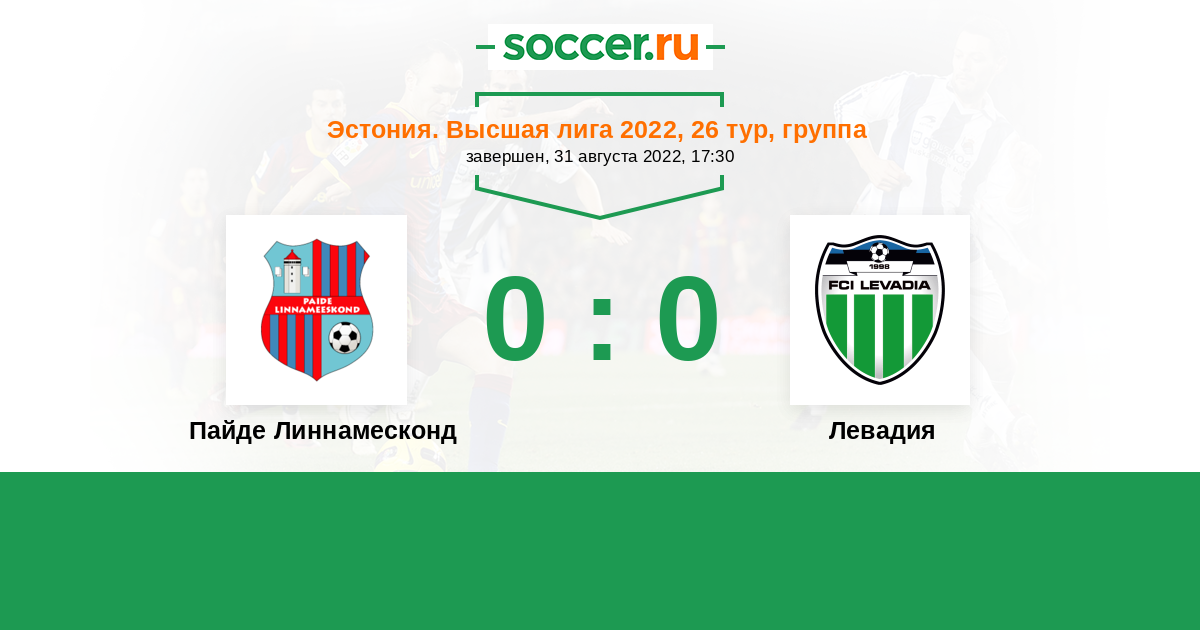 Эстония. Высшая лига 12.09.2014 Пайде Линнамесконд Логотип футбольный клуб Пайде Линнамесконд 0:3 Логотип футбольный клуб Левадия (Таллин) Левадия