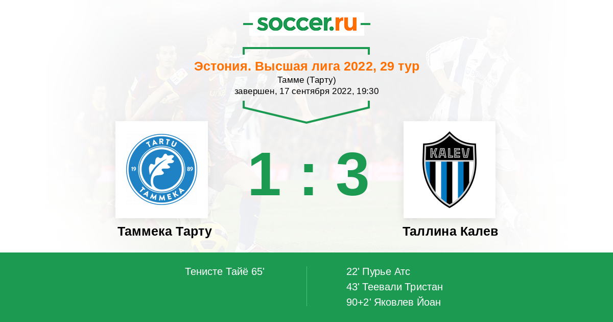 Эстония. Высшая лига 17.05.2022 Таммека Тарту Логотип футбольный клуб Таммека Тарту 1:3 Логотип футбольный клуб Таллина Калев Таллина Калев