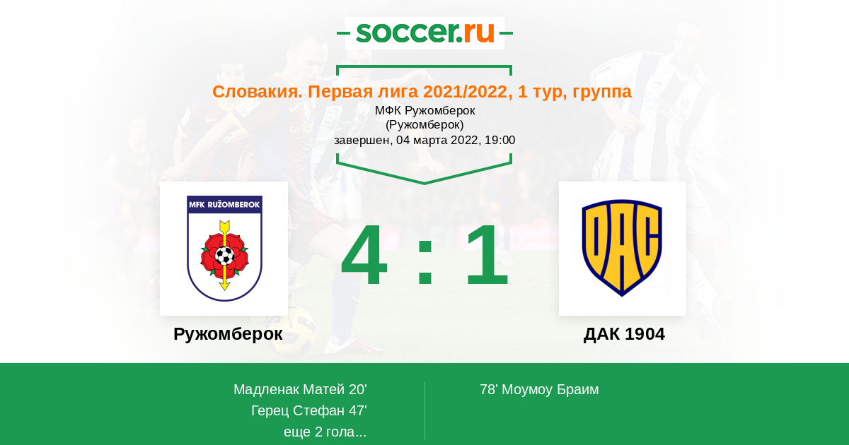 Словакия. Суперлига 18.09.2021 Ружомберок Логотип футбольный клуб Ружомберок 1:2 Логотип футбольный клуб ДАК 1904 (Дунайська Стреда) ДАК 1904