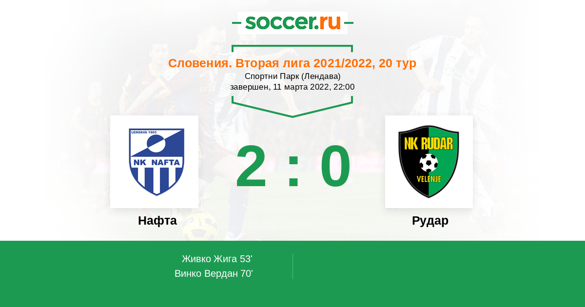 Словения. Вторая лига 24.03.2021 Нафта Логотип футбольный клуб Нафта (Лендава) 1:2 Логотип футбольный клуб Рудар (Велене) Рудар