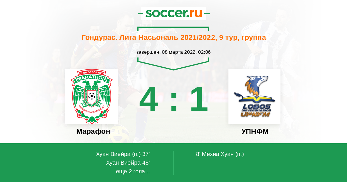 Гондурас. Лига Насьональ 01.05.2022 УПНФМ Логотип футбольный клуб УПНФМ (Тегусигальпа) 1:2 Логотип футбольный клуб Марафон (Сан-Педро-Сула) Марафон