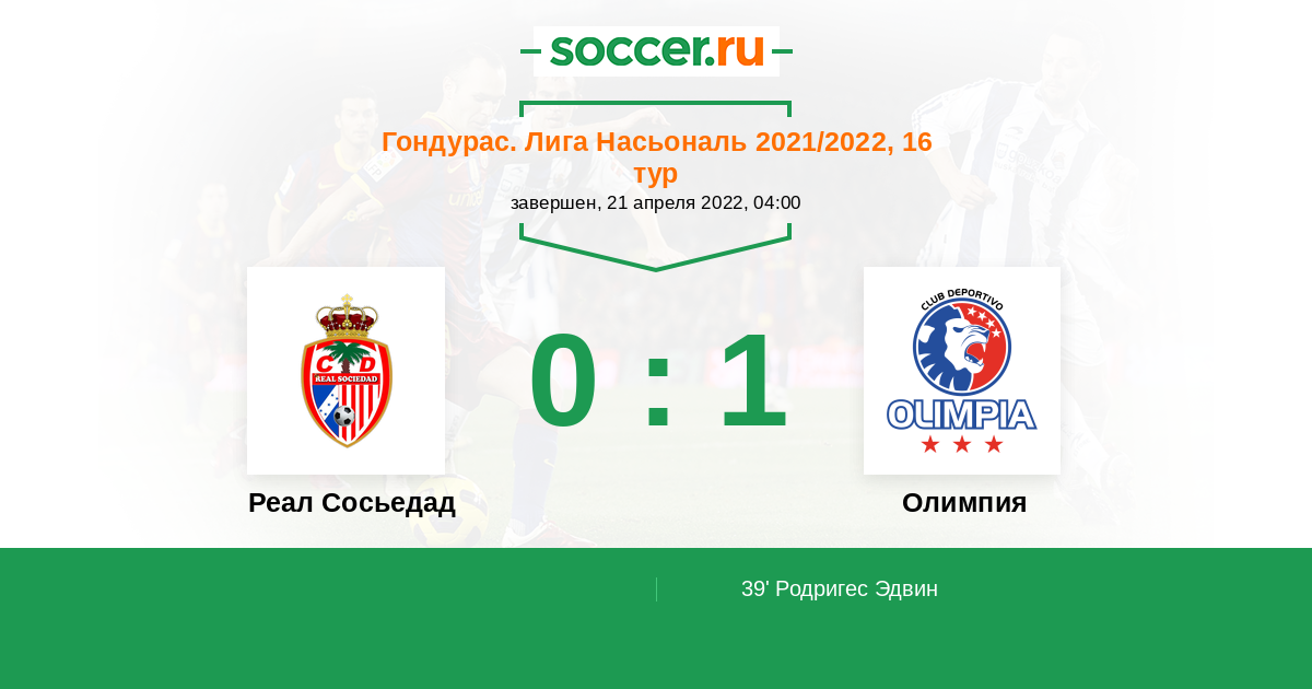 Гондурас. Лига Насьональ 04.04.2021 Олимпия Логотип футбольный клуб Олимпия (Тегусигальпа) 3:1 Логотип футбольный клуб Реал Сосьедад (Токоа) Реал Сосьедад