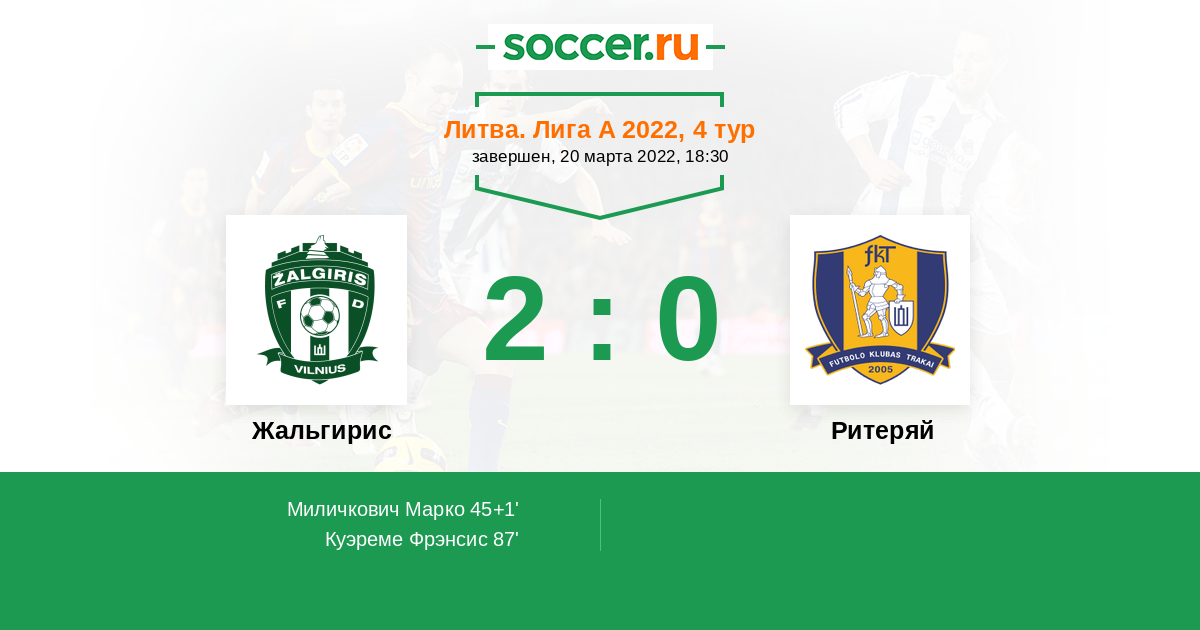 Литва. Лига А 16.03.2021 Жальгирис Логотип футбольный клуб Жальгирис (Вильнюс) 2:0 Логотип футбольный клуб Ритеряй (Тракай) Ритеряй