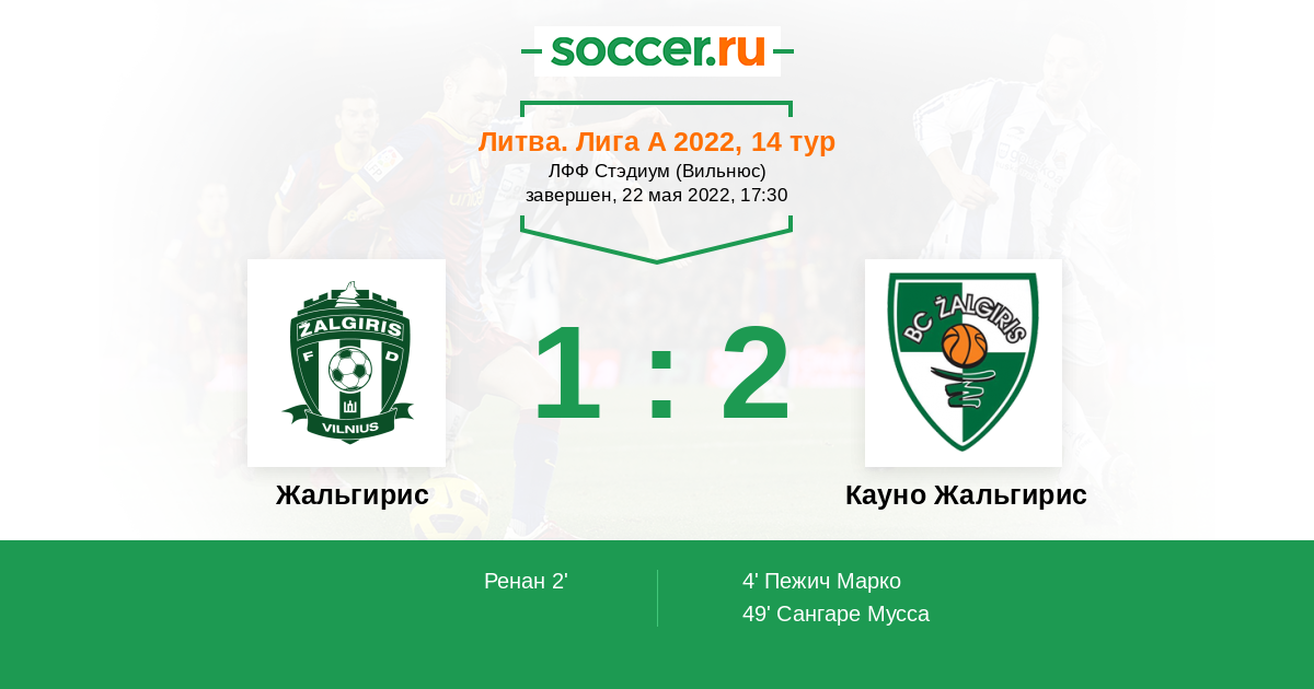 Литва. Лига А 23.11.2022 Жальгирис Логотип футбольный клуб Жальгирис (Вильнюс) 2:3 Логотип футбольный клуб Кауно Жальгирис (Каунас) Кауно Жальгирис
