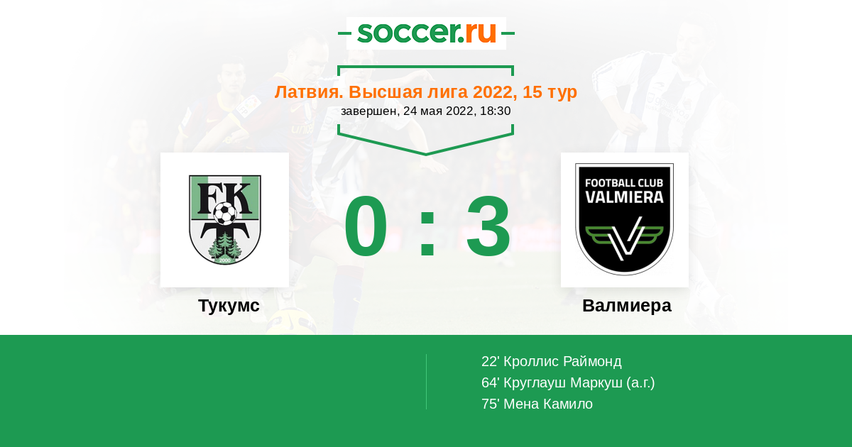 Латвия. Высшая лига 15.04.2022 Валмиера Логотип футбольный клуб Валмиера (Валмиера Гласс) 3:0 Логотип футбольный клуб Тукумс Тукумс