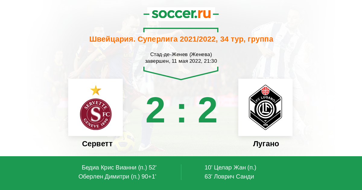 Швейцария. Суперлига 29.10.2022 Серветт Логотип футбольный клуб Серветт (Женева) 2:2 Логотип футбольный клуб Лугано Лугано