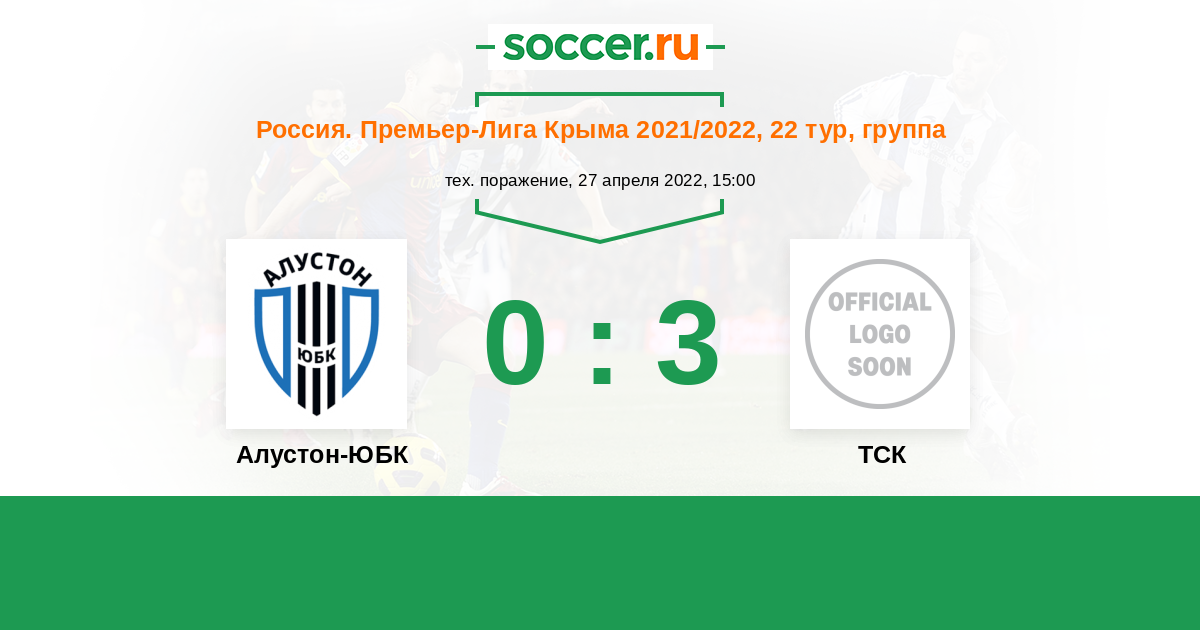 Россия. Премьер-Лига Крыма 27.04.2022 Алустон-ЮБК Логотип футбольный клуб Алустон-ЮБК (Алушта) 0:3 Логотип футбольный клуб ТСК (Симферополь) ТСК