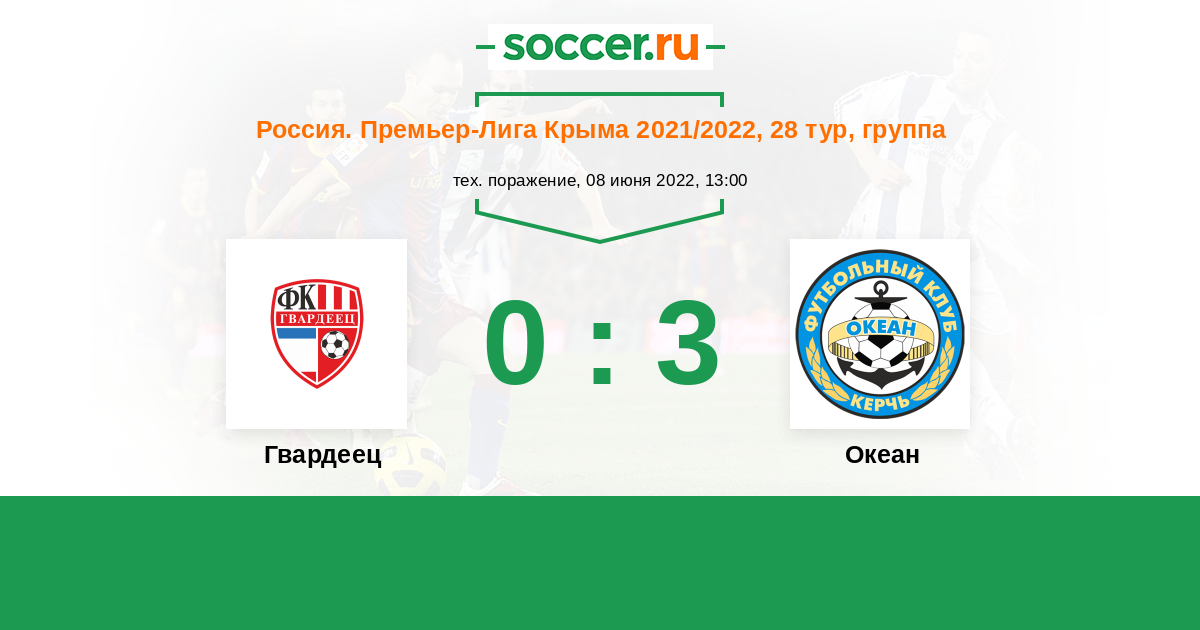Россия. Премьер-Лига Крыма 08.06.2022 Гвардеец Логотип футбольный клуб Гвардеец (Аграрное) 0:3 Логотип футбольный клуб Океан (Керчь) Океан