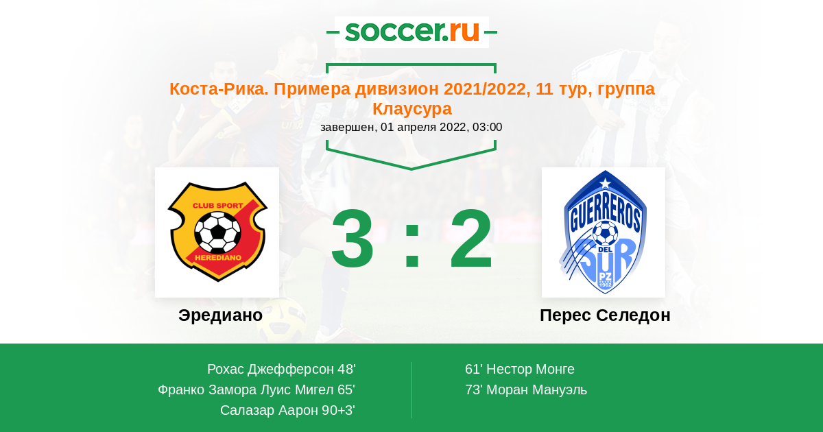 Коста-Рика. Примера дивизион 29.04.2012 Эредиано Логотип футбольный клуб Эредиано 1:1 Логотип футбольный клуб Зеледон (Сан Исидро де Эль Хенерал) Зеледон