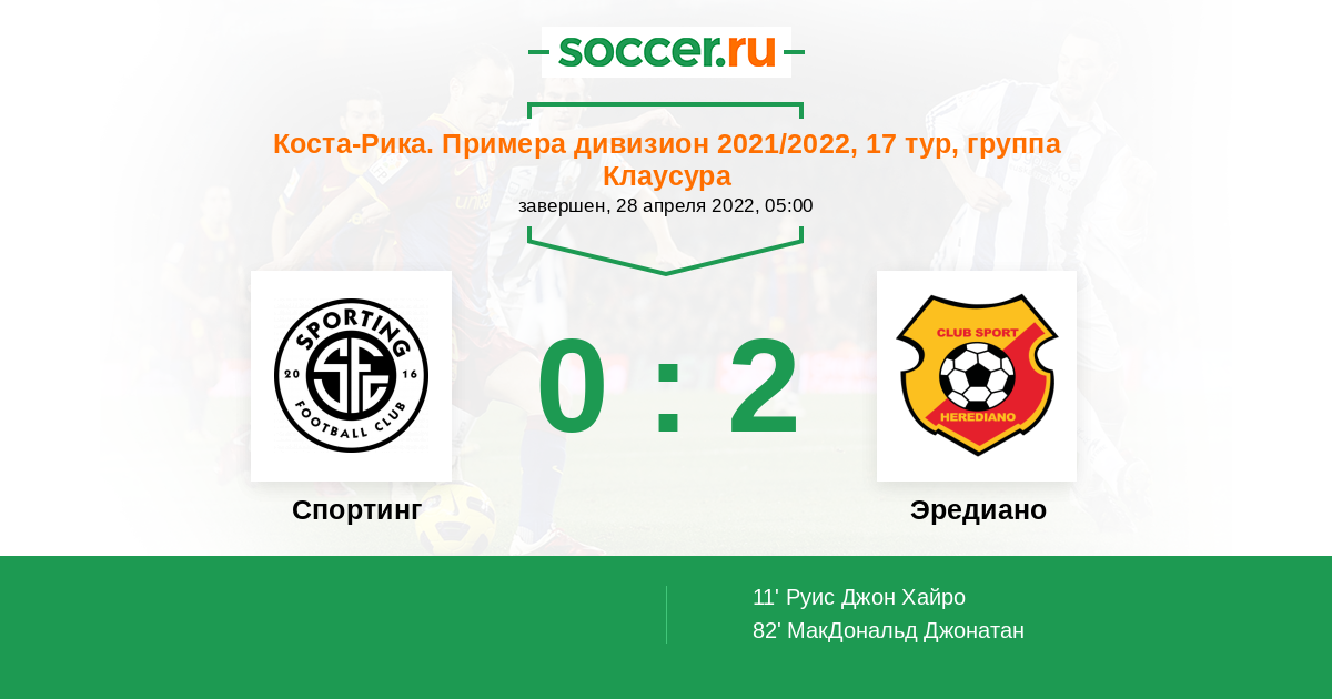Коста-Рика. Примера дивизион 01.11.2020 Эредиано Логотип футбольный клуб Эредиано 4:2 Логотип футбольный клуб Спортинг Сан-Хосе Спортинг Сан-Хосе