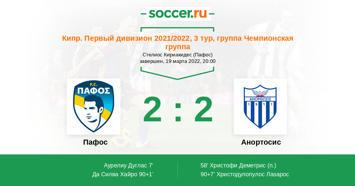 Кипр. Первый Дивизион 22.09.2019 Анортосис Логотип футбольный клуб Анортосис (Ларнака) 2:0 Логотип футбольный клуб Пафос Пафос