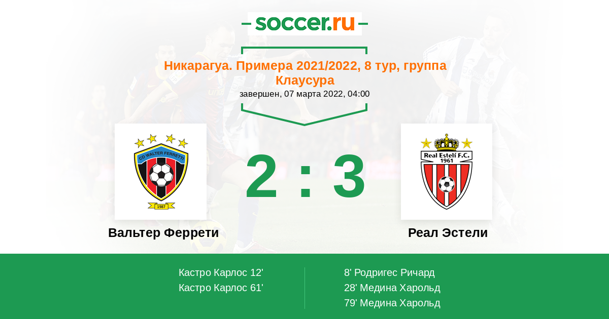 Никарагуа. Примера 09.05.2022 Вальтер Феррети Логотип футбольный клуб Вальтер Феррети (Манагуа) 2:3 Логотип футбольный клуб Реал Эстели Реал Эстели