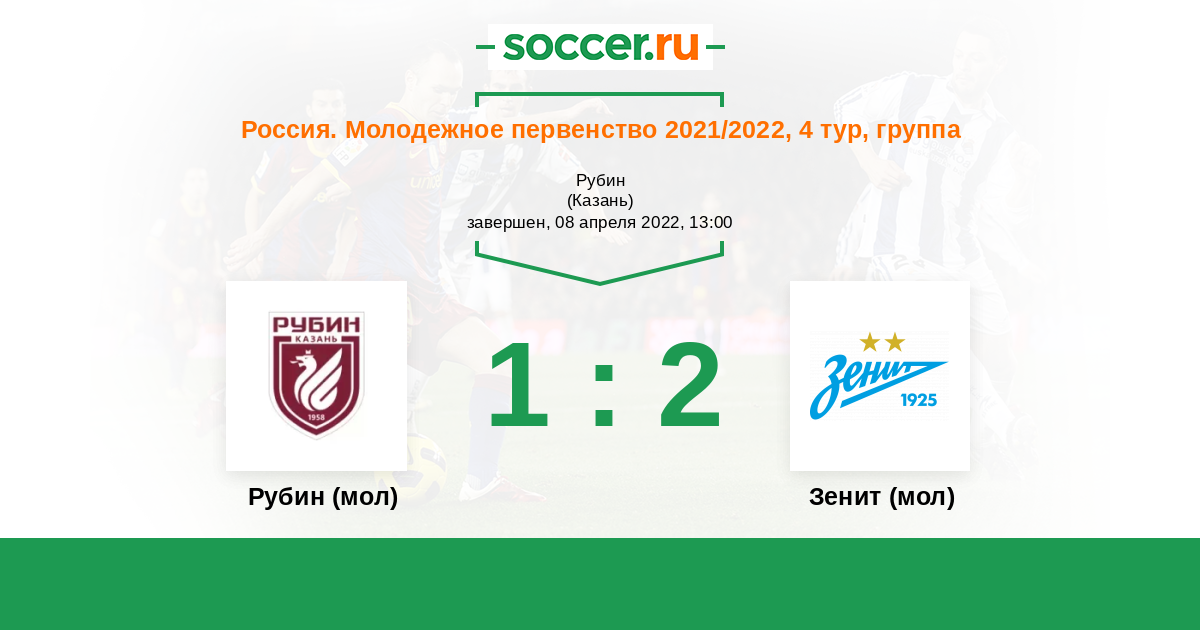 Россия. Премьер-Лига U21 12.08.2018 Рубин (мол) Логотип футбольный клуб Рубин (мол) (Казань) 3:0 Логотип футбольный клуб Зенит (мол) (Санкт-Петербург) Зенит (мол)