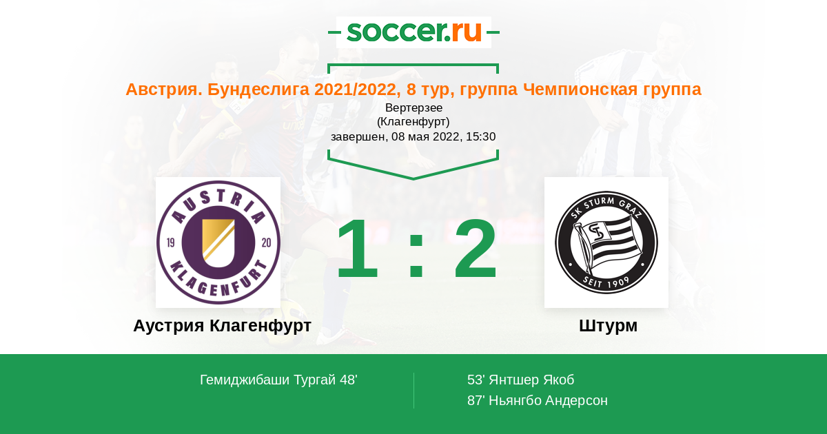 Австрия. Бундеслига 12.12.2021 Аустрия Клагенфурт Логотип футбольный клуб Аустрия Клагенфурт 0:3 Логотип футбольный клуб Штурм (Грац) Штурм